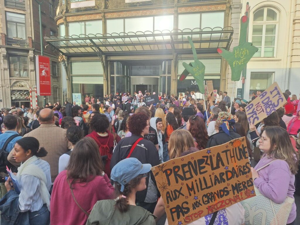 De nombreuses organisations associatives, politiques et citoyennes étaient présentes au départ de la marche pour tirer la sonnette d’alarme sur la situation des droits des femmes aujourd’hui. L’arrivée au pouvoir de dirigeants de droite et d’extrême-droite, comme Trump aux Etats-Unis, a des conséquences énormes sur les droits des femmes et des personnes LGBTQIA+ qui sont attaqués partout dans le monde, tel que le droit à l’avortement ou encore la reconnaissance des personnes transgenres. Les guerres au Moyen-Orient, au Soudan, en Ukraine touchent en particulier les femmes qui ont les conditions les plus précaires dans la société et doivent porter leur famille. Et en Belgique, les attaques du gouvernement Arizona contre la sécurité sociale et les conditions de travail frappent également en plus grande partie les femmes.
